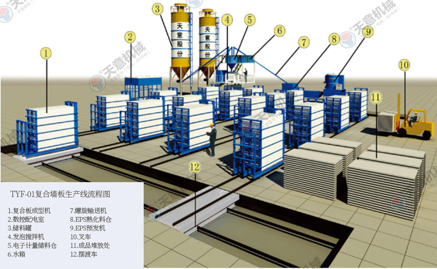 TY12型墻板生產(chǎn)線包括:墻板成型機、整體穿抽管系統(tǒng)、發(fā)泡系統(tǒng)、水箱、電子計量儲料倉、螺旋上料輸送機、儲料罐、螺旋輸送機、EPS熟化料倉、硫化干燥床、EPS預發(fā)機、數(shù)控配電室、發(fā)泡攪拌機、整體出板系統(tǒng)、叉車、成品堆放區(qū)、擺渡車。