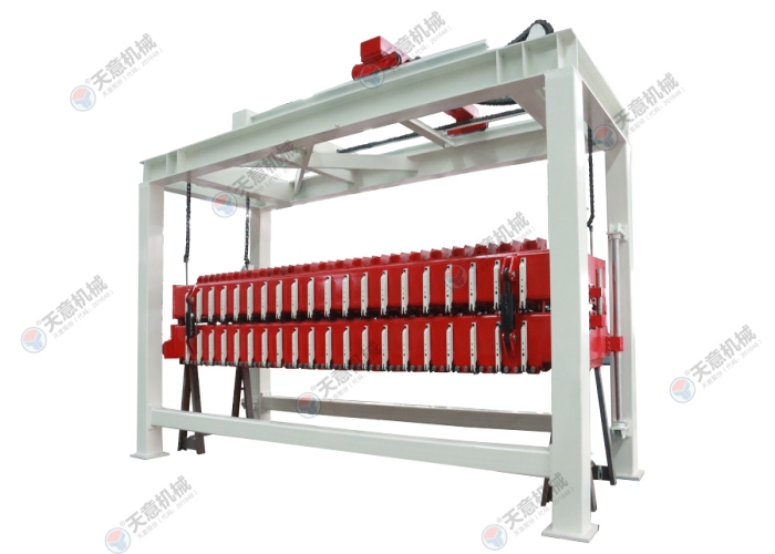 脫模后的坯體連同側(cè)板一起放置在切割小車上,切割小車由減速電機驅(qū)動行走,通過縱向切割機完成縱向切割,切割小車繼續(xù)行走至橫向 切割機中間位置停止后,由小車置換裝置將側(cè)板連同坯體抬起,切割小車退回翻轉(zhuǎn)行車底下進行下一次承載脫模后的坯體,另外一部切割小車 進入置換裝置底下后, 置換裝置將側(cè)板連同坯體放置該切割小車上后,橫向切割動作后啟動進行橫向切割動作,切割完成后,切割小車再行走至確地行車底下,再由 翻轉(zhuǎn)去底行車將坯體去底(連側(cè)板)吊至蒸養(yǎng)小車上,切割小車范圍原始位置進行下一個切割循環(huán)。