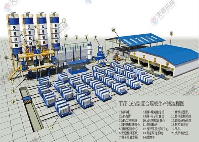 TYF-16A型復(fù)合墻板生產(chǎn)線是天意機械公司綜合國內(nèi)外技術(shù)經(jīng)驗,開發(fā)研制的新型墻體板材生產(chǎn)線。復(fù)合墻板生產(chǎn)線主要分為配料系統(tǒng)、攪拌系統(tǒng)、發(fā)泡系統(tǒng)、數(shù)控配電系統(tǒng)、墻板成型系統(tǒng)、料漿泵送系統(tǒng)、EPS預(yù)發(fā)系統(tǒng)、液壓循環(huán)系統(tǒng)、整體出板系統(tǒng)。